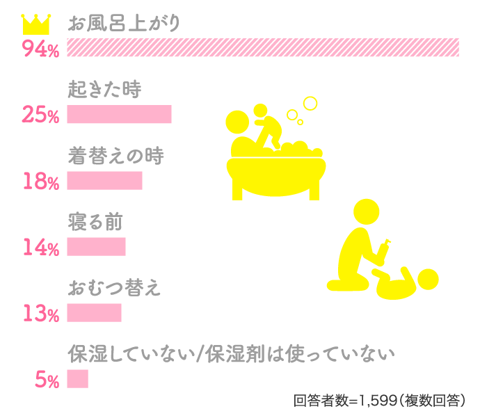 保湿のタイミングは、お風呂上がりが断トツで多い結果に。赤ちゃんの体が冷える前にサッとケアできるように、あらかじめ準備しておくとよいですね。