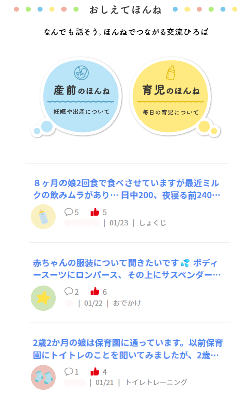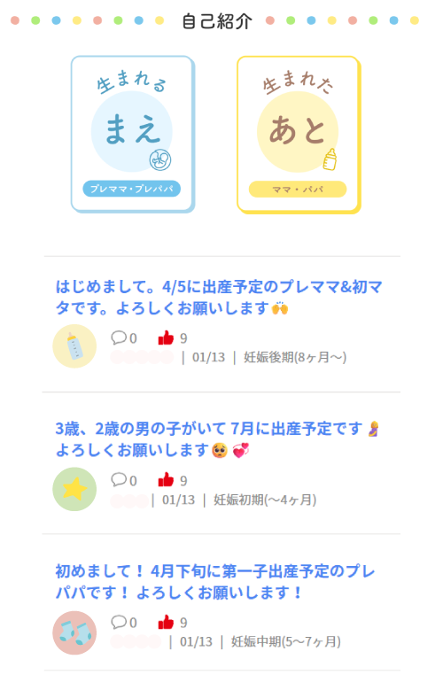自己紹介は、プレママ・プレパパのおへやと、育児ママ・パパのおへやに分かれています。 それぞれのおへやで交流を深めることができます。